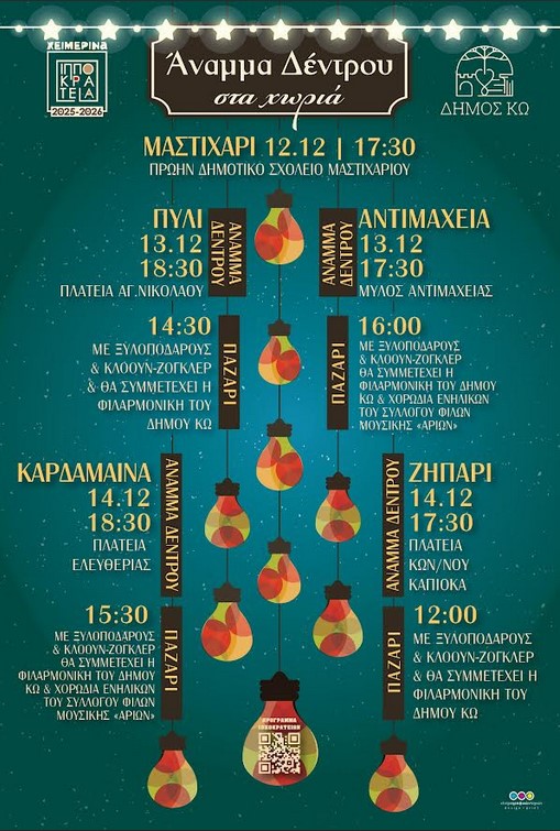 Από αύριο Παρασκευή 12/12/25 και έως την Κυριακή 14/12/25 θα φωταγωγηθούν τα Χριστουγεννιάτικα Δέντρα σε Μαστιχάρι, Πυλί, Αντιμάχεια, Ζηπάρι και Καρδάμαινα.