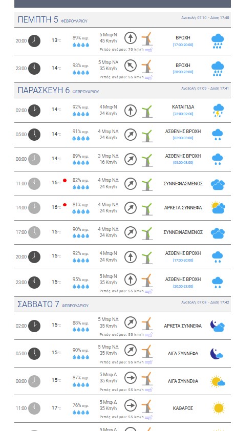 Το Έκτακτο Δελτίο Επιδείνωσης Καιρού εξακολουθεί να ισχύει ως έχει σύμφωνα και με τα τελευταία προγνωστικά στοιχεία. Πιο συγκεκριμένα : Οι ισχυρές βροχές και καταιγίδες που εκδηλώνονται τις τελευταίες ώρες στη βορειοδυτική χώρα, αύριο Πέμπτη (05-02-26) θα επεκταθούν και σε όλη τη δυτική Ελλάδα, τα βορειοανατολικά ηπειρωτικά και την ανατολική νησιωτική χώρα, ενώ πιθανώς θα εκδηλωθούν κατά τόπους και χαλαζοπτώσεις. Πολύ ισχυροί νότιοι νοτιοανατολικοί άνεμοι εντάσεως 8 και τοπικά 9 μποφόρ θα πνέουν την Πέμπτη από το πρωί μέχρι το απόγευμα στο Ανατολικό Αιγαίο. Κατά τόπους ισχυρές βροχές και καταιγίδες, πιο αναλυτικά, προβλέπονται: α. στο βόρειο τμήμα του Ιονίου (περιοχή Κέρκυρας, Διαποντίων νήσων, Παξών) και την Ήπειρο έως και τις πρωινές ώρες της Πέμπτης β. στα υπόλοιπα νησιά του Ιονίου (περιοχή Λευκάδας, Ιθάκης, Κεφαλονιάς, Ζακύνθου) και τη δυτική Στερεά από τις πρώτες ώρες της Πέμπτης έως και το απόγευμα γ. στη δυτική και νότια Πελοπόννησο από νωρίς το πρωί της Πέμπτης έως αργά το βράδυ δ. στην ανατολική Μακεδονία και τη Θράκη από τις πρωινές ώρες της Πέμπτης μέχρι τη νύχτα ε. στα νησιά του βορείου και ανατολικού Αιγαίου από το μεσημέρι της Πέμπτης μέχρι τις πρώτες πρωινές ώρες της Παρασκευής (06-02-26) στ. στα Δωδεκάνησα από το απόγευμα της Πέμπτης μέχρι και το πρωί της Παρασκευής (06-02-26). Μπορείτε να έχετε μια γενική εικόνα για την εξέλιξη του καιρού, μέσα από την ιστοσελίδα της ΕΜΥ (oldportal.emy.gr). Το παρόν Έκτακτο Δελτίο θα ανανεωθεί σε 12 ώρες. Ενημερωθείτε και μέσω των επίσημων προειδοποιήσεων του Meteoalarm σε Ελλάδα και Ευρώπη.