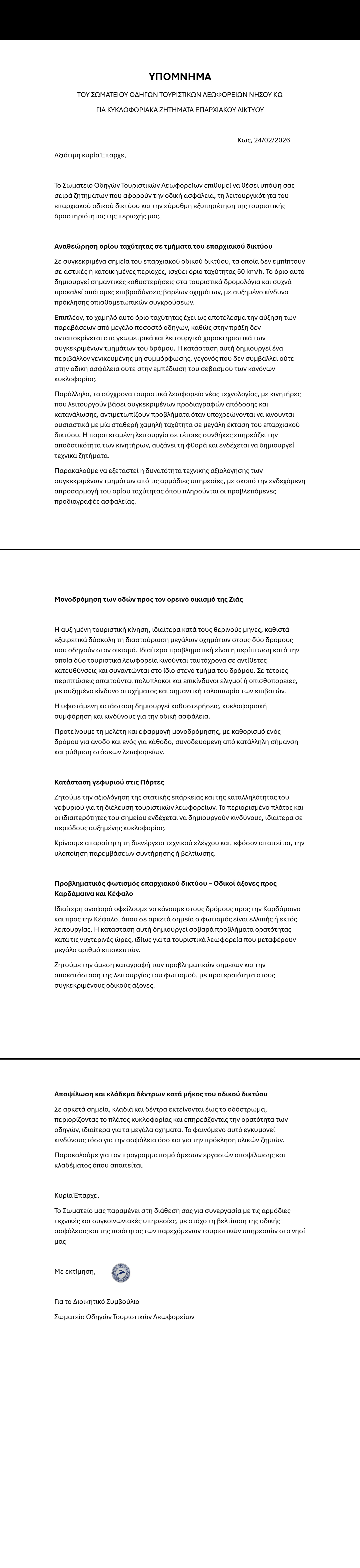 Εν Δωδεκανήσω Σωματείο Οδηγών Τουριστικών λεωφορείων: Υπόμνημα για κυκλοφοριακά ζητήματα Επαρχιακού Δικτύου Κω
