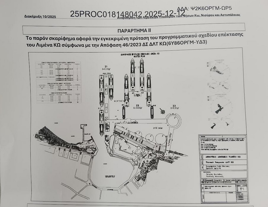 Ο  διαγωνισμός  αξίας 677.086 ευρώ είχε καταληκτική ημερομηνία κατάθεσης προσφορών 26-1-2026. Το κείμενο του διαγωνισμού περιέχει την πρόταση του σχεδίου επέκτασης του λιμένα Κω.