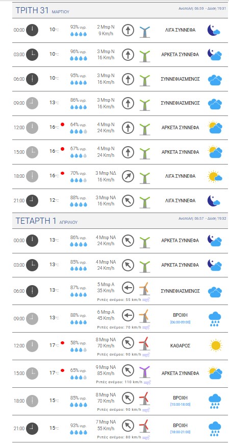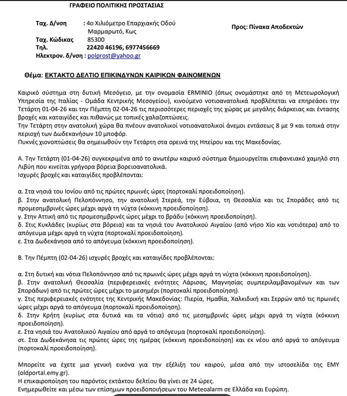 ΕιδήσειςΤα εν δήμω Πολιτική Προστασία Κω: Έκτακτο δελτίο επιδείνωσης καιρού καταιγίδες και ΝΑ άνεμοι 8-9 μποφόρ στην περιοχή μας! Από aegeanews - 30 Μαρ 2026 0 190 Κοινοποίηση στο Facebook Μοιραστείτε στο X ΜΕΤΕΟ ΚΩΣ: