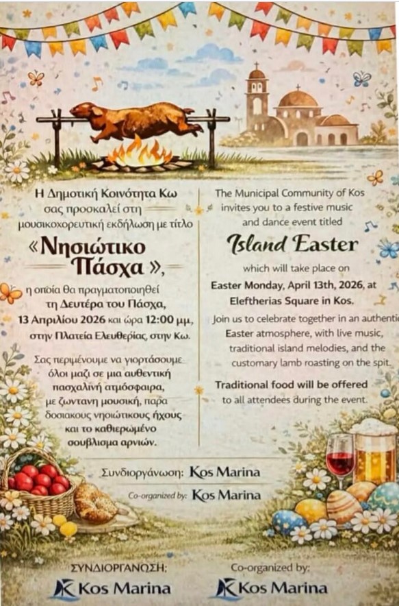Η Δημοτική Κοινότητα Κω σας προσκαλεί στη μουσικοχορευτική εκδήλωση με τίτλο «Νησιώτικο Πάσχα», η οποία θα πραγματοποιηθεί τη Δευτέρα του Πάσχα, 13 Απριλίου 2026 και ώρα 12:00 μ.μ., στην Πλατεία Ελευθερίας, στην Κω.