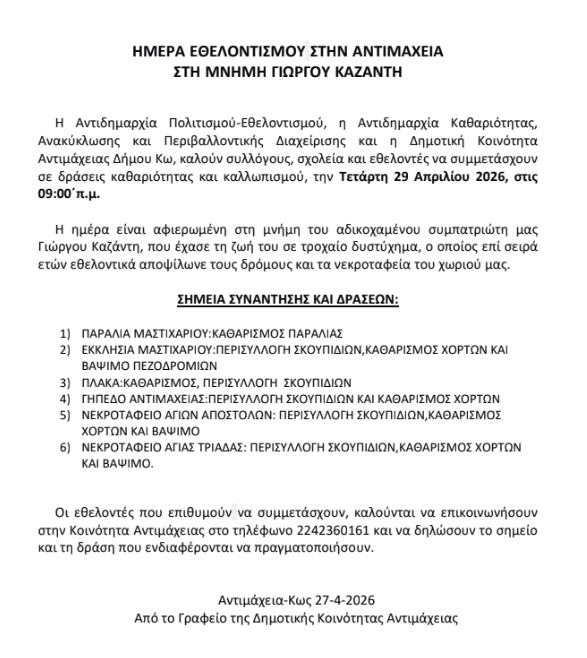 Τα εν δήμω Ημέρα εθελοντισμού στην Αντιμάχεια στη μνήμη του Γιώργου Καζάντη την Τετάρτη