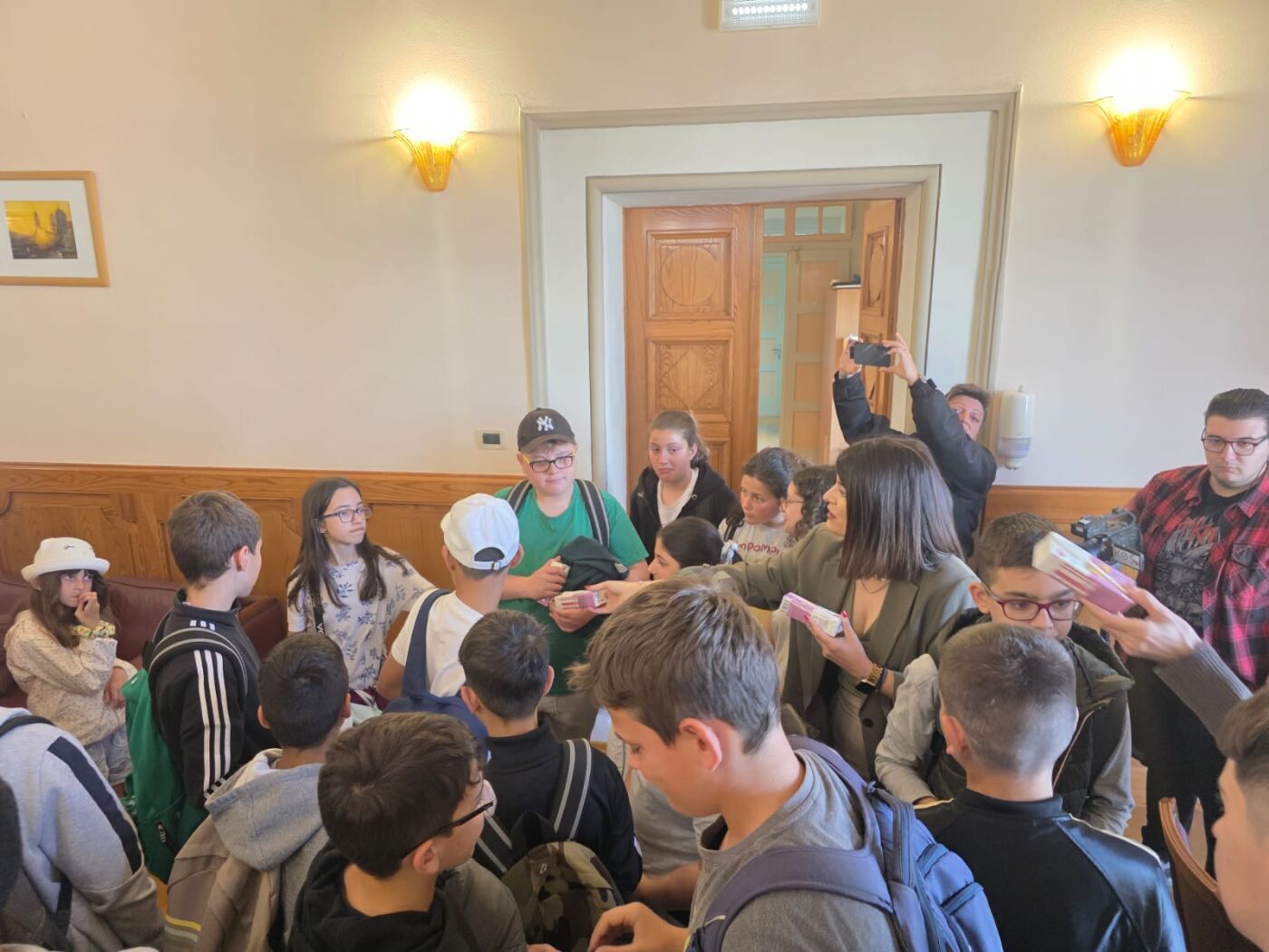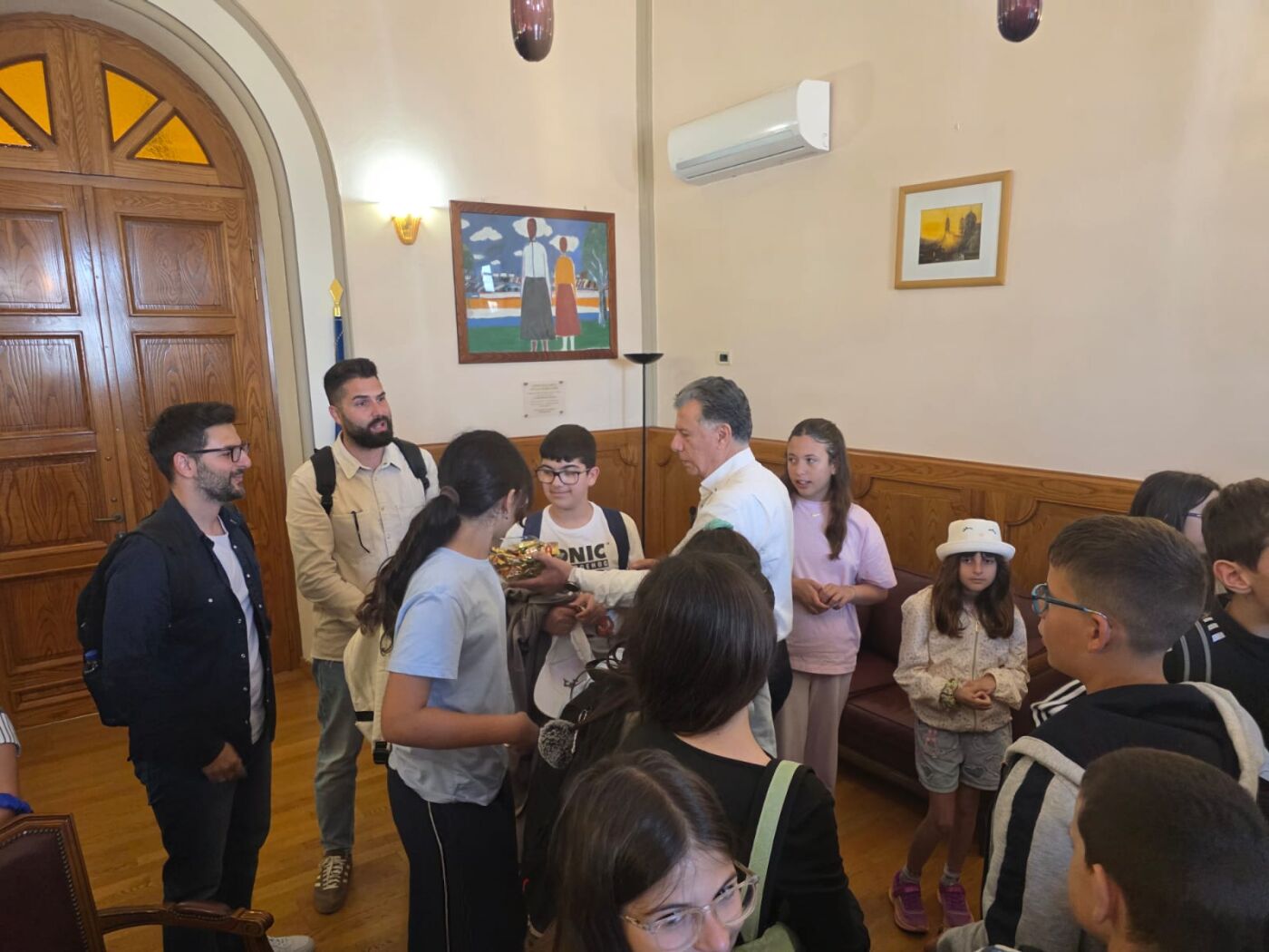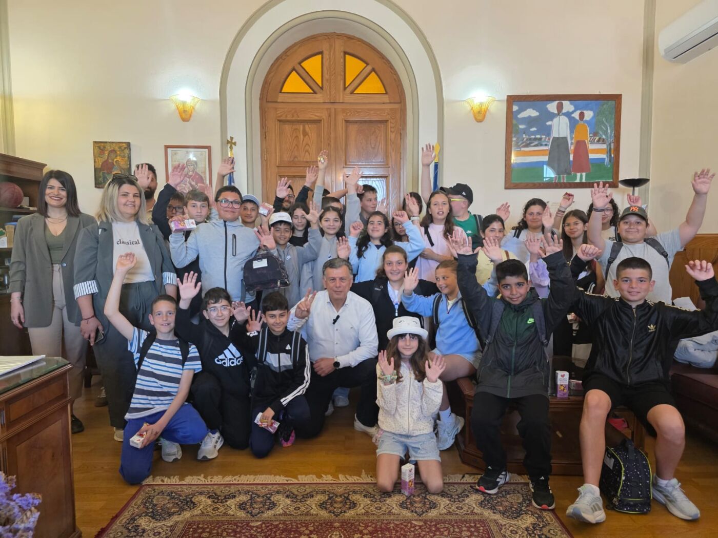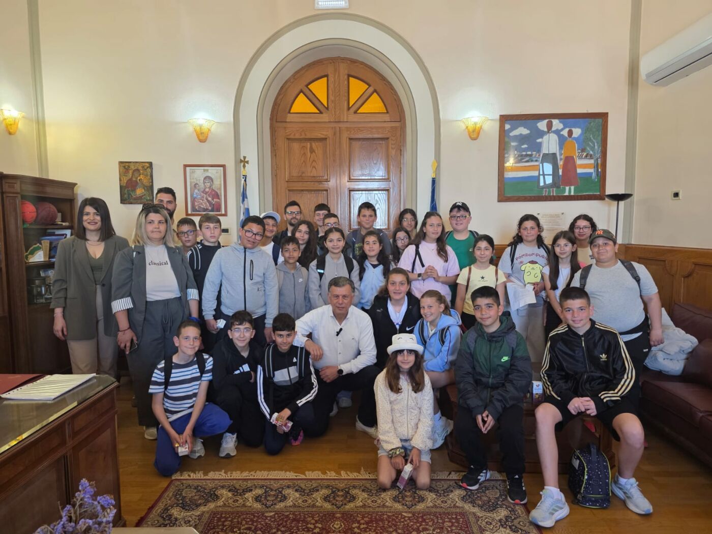 Ο δήμαρχος Θεοδόσης Νικηταράς υποδέχθηκε και καλωσόρισε μαθητές και εκπαιδευτικούς στο γραφείου του μαζί με την Αντιδήμαρχο Κοινωνικής Πολιτικής – Πρόνοιας και Δημοτικής Συγκοινωνίας Διονύσια Γιαννούλη.