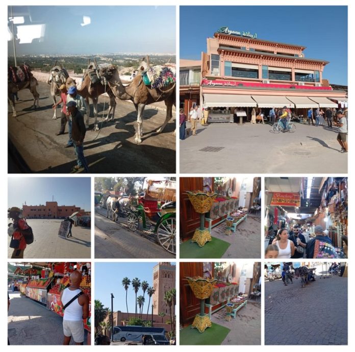 Εκεί που η Μεσόγειος απλώνει το χέρι και συναντά τον ανήσυχο Ατλαντικό Ωκεανό, βρίσκεται το Μαρόκο. Περιδιαβαίνω μαζί με δεκάδες τουρίστες, τα στενά σοκάκια, της περίκλειστης πόλης Μεντίνας, στο Μαρακές.  Εκεί   στα εντυπωσιακά Σουκς, στα στενάχωρα καλντερίμια,  βρίσκεται όλη η εμπορική ζωή του Μαρακές, με το ροδόχρουν κοκκινωπό χρώμα. Μαρόκο, ο πιο συναρπαστικός, τουριστικός προορισμός, ένα ζωντανό μωσαϊκό ιστορίας, πολιτισμού, φυλών και γλώσσας.  Το Μαρόκο συνδυάζει ξεχωριστή, πολιτιστική πολυμορφία, άγρια φυσική ομορφιά, με άνυδρες ερήμους, βουνά και καταπράσινες οάσεις,  πλούσια αγορά και πολλές απρόσμενες, ταξιδιωτικές εμπειρίες. Όλα  αυτά, σαν μια φωτογραφία, γεμάτη χρώματα και αντιθέσεις.                   Στην γραφική  παράκτια περιοχή, που την βρέχει ο Ατλαντικός την Εσαουίρα,  τα ψαροχώρια και οι άπειρες μπλε βάρκες, όπως τις βρήκαμε στριμωγμένες στο λιμανάκι,   έχουν το δικό τους θαλασσινό   χρώμα. Παράλληλα από το ύψος του Κάστρου, θαυμάσαμε τα αεικίνητα κύματα του Ατλαντικού, όσο οι ζωγράφοι και οι καλλιτέχνες μουσικοί και οι υπαίθριοι ζογκλέρ, μας  διασκέδαζαν.  Στις ατέρμονες  διαδρομές, κρυμμένος όλος ο θησαυρός της αγροτικής ζωής.  Διότι  το Μαρόκο είναι αύταρκες, με πλήθος γεωργικών προϊόντων  και έχει νερό, όσο και αν μας παραξενεύει  η υπέρ-Σαχάρια θέση του. Εδώ  οι αγρότες είναι γνήσιοι, αυθεντικοί. Πολλοί  δουλεύουν  τη  γη τους  με  τα υποζύγια, όπως γαϊδουράκια και  βοοειδή.  Επίσης μεταφέρουν τους καρπούς, με τα υποζύγια, κυρίως γαϊδουράκια, καμήλες και μερικά άλογα.  Παράλληλα τα άλογα, τα χρησιμοποιούν πιο πολύ στις άμαξες,  που κάνουν ατέλειωτες βόλτες τους τουρίστες. Έχουν ανεπτυγμένη την υφαντουργία, με περίτεχνα  χειροποίητα χαλιά και λοιπά προϊόντα.  Αλλά και την κεραμοποιία,  με άριστους καλλιτέχνες,  αγγειοπλάστες   που φτιάχνουν περιζήτητα, πήλινα χρηστικά και διακοσμητικά ειδη, με το  πιο διαδεδομένο, το κωνοειδές σκεύος το ταντζί, όπου μέσα ψήνουν κρέας   και λαχανικά με μπαχαρικά στο φούρνο.  Στην κεντρική πλατεία του Μαρακές, συμβαίνουν  τα πιο παράξενα γεγονότα. Μικρές  μαϊμούδες   χορεύουν, γητευτές φιδιών,   παίζουν μουσική, στις  μαύρες κόμπρες, πλανόδιοι κάθε ηλικίας,   προσπαθούν να πουλήσουν τα πάντα. Οι εικόνες εναλλάσσονται, από τα βραχώδη όρη και τους γυμνούς λόφους του Άτλαντα, με τα εντυπωσιακά φαράγγια, μέχρι τις καταπράσινες οάσεις, με φοινικόδεντρα, ελιές και αργανιές ή αργανόδεντρα. Στην  ελαιοπαραγωγή το Μαρόκο, συναγωνίζεται  σήμερα,  τις άλλες χώρες της Μεσογείου. Όσο  για το αργκανέλαιο λίγο και πολύτιμο, σαν το χρυσάφι,  είναι ένα προϊόν εντοπιότητας, όπως το δικό μας το Χιώτικο μαστίχι. Αναφέροντας το μαστίχι, στο Μαρόκο, θα βρείτε πληθώρα και ποικιλία μπαχαρικών και τσαγιού. Επίσης  άλλο ένα προϊόν, είναι το ροδόνερο, από τα ροδοπέταλα και το ανθόνερο, από τα εσπεριδοειδή. Ποιος ο λόγος να επισκεφτώ το Μαρόκο, αν δεν δω την σκληρή και επίπονη, μοναδική στη Μεσόγειο επεξεργασία δερμάτων, όπως καμήλας, βουβαλιού, κατσίκας και αρνιού, που εκτρέφονται σε αυτή τη χώρα; Θα  επισκεφτώ το Μαρόκο, για το ξεχωριστό ηλιοβασίλεμα, στη  Μερτζούγκα, στις παρυφές της ερήμου Σαχάρας, με την ροδόχρου άμμο, πάνω σε μια καμήλα. Ακόμη και  σε ένα τζιπ 4χ4, να με βολτάρει στους κοκκινωπούς αμμόλοφους.  Αλλά και η παρουσία χιονιού, σε αυτή την Αφρικανική χώρα, θα μας εκπλήξει, με τις πίστες 