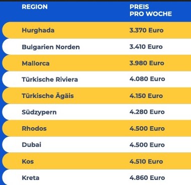 Στην αντίπερα όχθη, πιο οικονομικός προορισμός είναι η Χουργκάντα (3.370 ευρώ), ενώ και η Μαγιόρκα (3.980), όπως και η Τουρκική Ριβιέρα (4.080 ευρώ) είναι αρκετά πιο οικονομικοί από τους τρεις ελληνικούς προορισμούς.