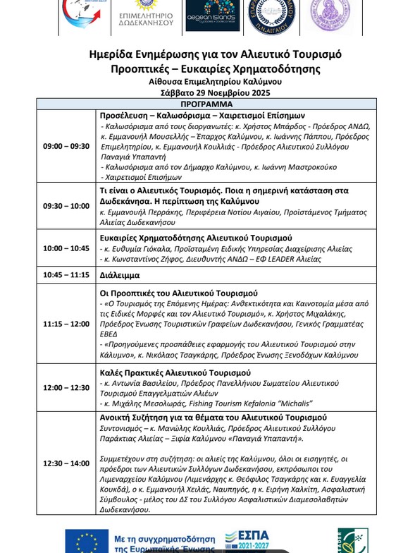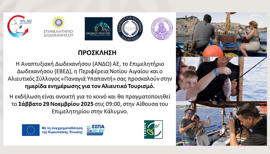 Η εκδήλωση, που αναμένεται να λάβει χώρα προς το τέλος Νοεμβρίου (2025) στην αίθουσα του Επιμελητηρίου Δωδεκανήσου, συνδιοργανώνεται από την Αναπτυξιακή Εταιρεία Δωδεκανήσου (ΑΝ.ΔΩ.), το Επαρχείο Περιφερειακής Ενότητας Καλύμνου, το Επιμελητήριο Δωδεκανήσου και τον Αλιευτικό Σύλλογο Καλύμνου «Παναγία Υπαπαντή».