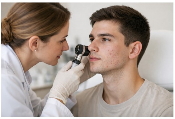 Η διάγνωση της ακμής βασίζεται στην κλινική εξέταση και στην αξιολόγηση της μορφής και της κατανομής των βλαβών. Σε ορισμένες περιπτώσεις, ιδιαίτερα όταν υπάρχουν ενδείξεις ορμονικής διαταραχής, μπορεί να ζητηθούν συμπληρωματικές εξετάσεις. Η σωστή αξιολόγηση επιτρέπει την επιλογή της κατάλληλης θεραπείας και την πρόληψη μόνιμων βλαβών.